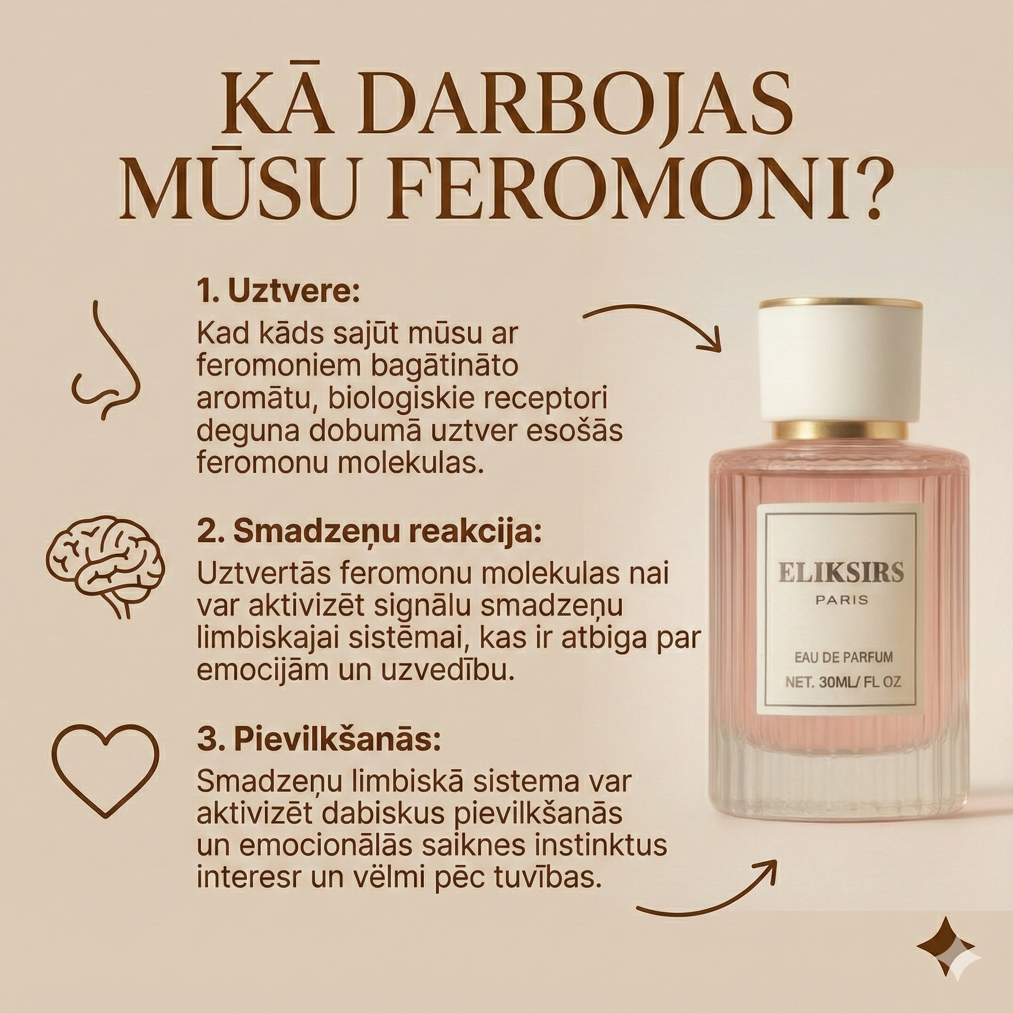 Eliksīrs izmanto dabiskus feromonus, kas nemanāmi pastiprina jūsu personīgo aromātu un piesaista vīriešu uzmanību.
